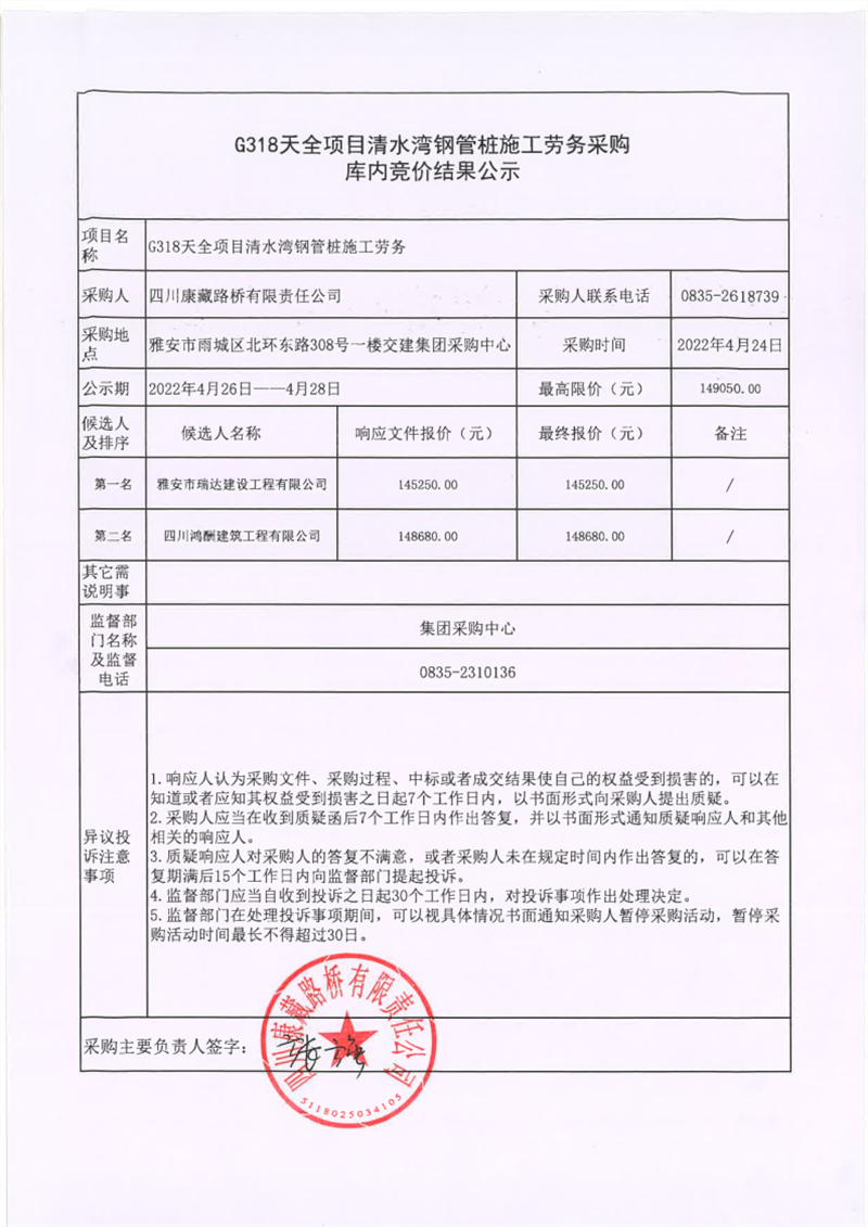四川康藏路橋有限責任公司G318天全項目清水灣鋼管樁施工勞務采購庫內競價結果公示