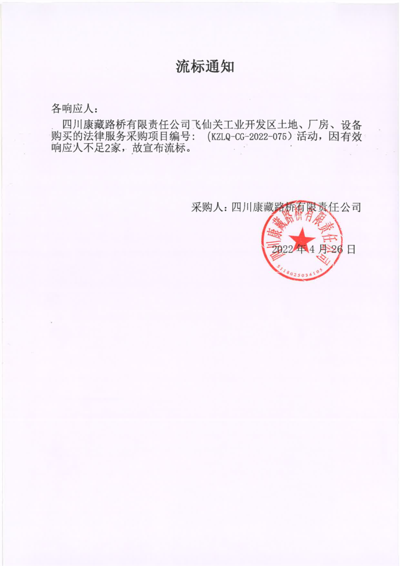 四川康藏路橋有限責(zé)任公司飛仙關(guān)工業(yè)開(kāi)發(fā)區(qū)土地、廠房、設(shè)備購(gòu)買的法律服務(wù)采購(gòu)項(xiàng)目流標(biāo)通知