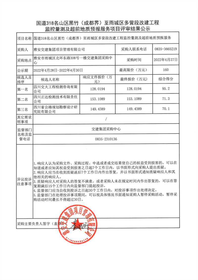 雅安交建集團(tuán)項(xiàng)目管理有限公司國道318名山區(qū)黑竹(成都界)至雨城區(qū)多營段改建工程監(jiān)控量測及超前地質(zhì)預(yù)報(bào)服務(wù)項(xiàng)目評審結(jié)果公示