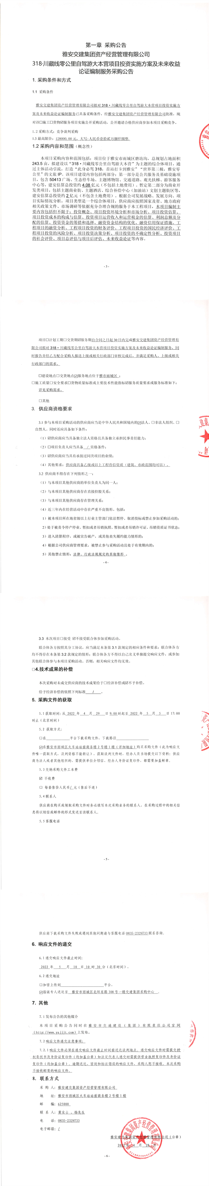 雅安交建集團資產經營管理有限公司318·川藏線零公里自駕游大本營項目投資實施方案及未來收益論證編制服務采購公告