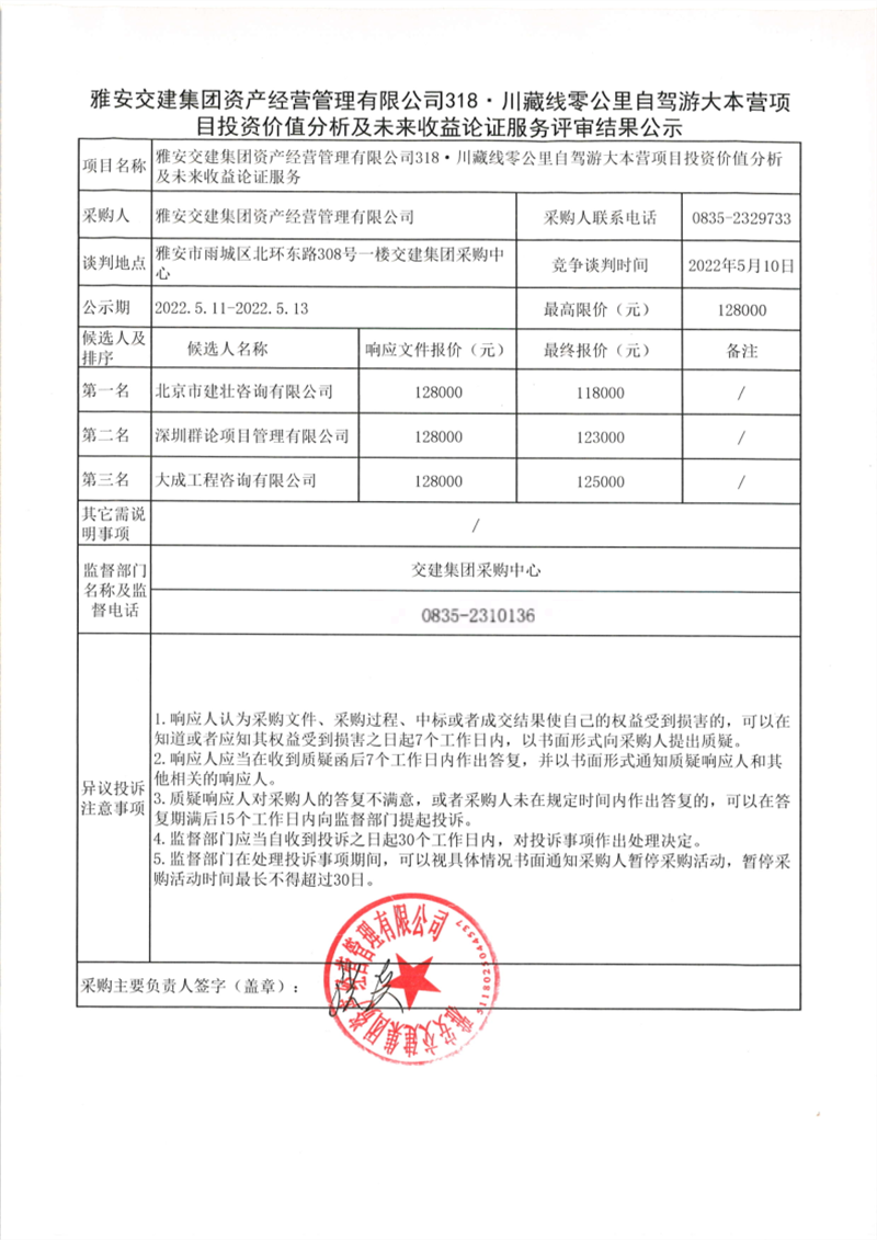 雅安交建集團(tuán)資產(chǎn)經(jīng)營管理有限公司318·川藏線零公里自駕游大本營項(xiàng)目投資價(jià)值分析及未來收益論證服務(wù)評審結(jié)果公示