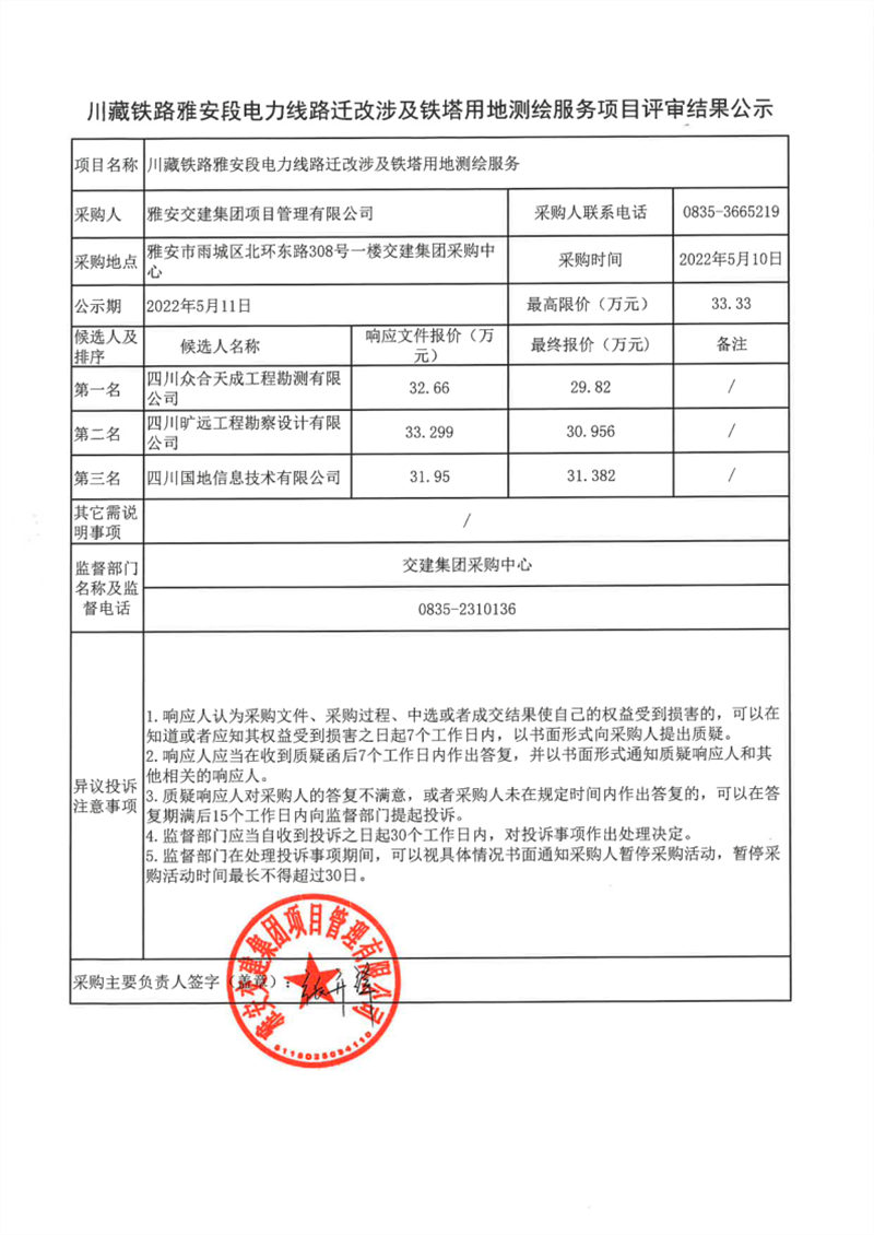 雅安交建集團(tuán)項(xiàng)目管理有限公司川藏鐵路雅安段電力線路遷改涉及鐵塔用地測繪服務(wù)項(xiàng)目評(píng)審結(jié)果公示