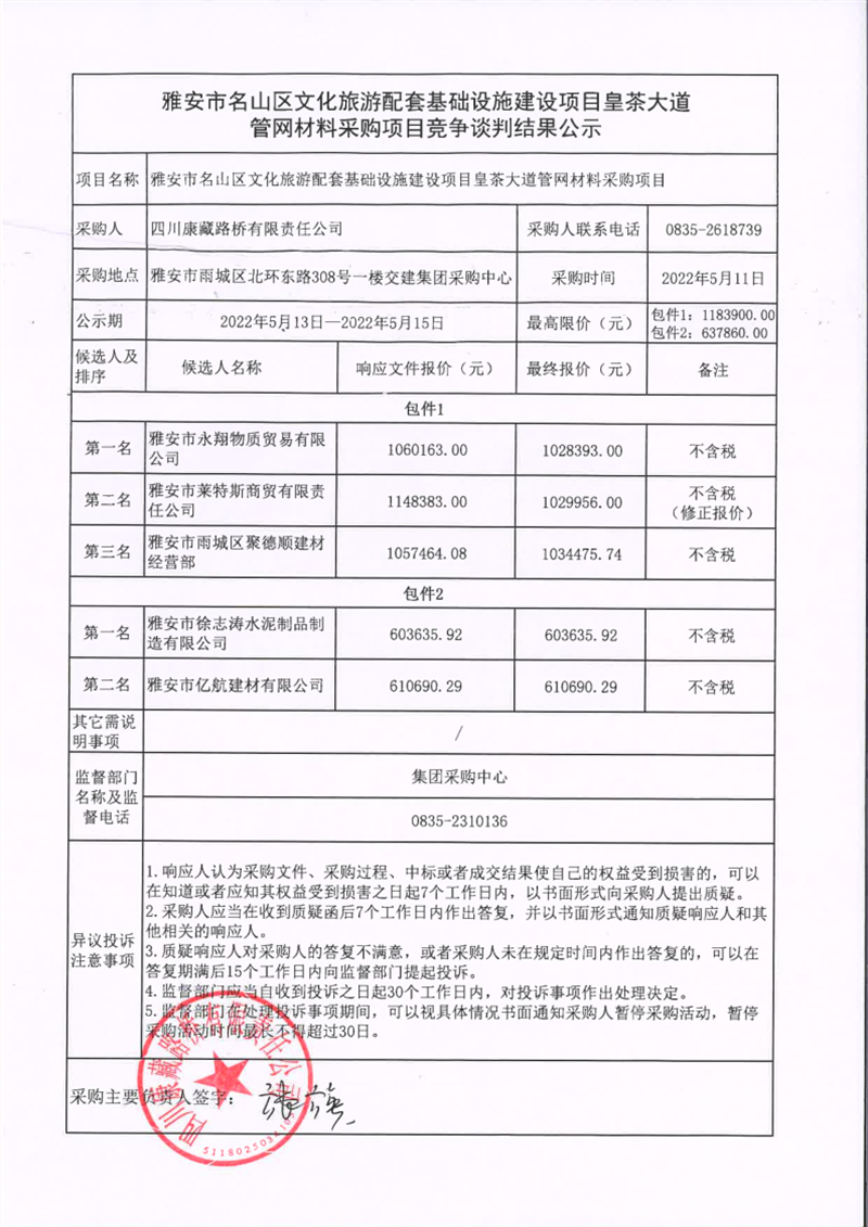 四川康藏路橋有限責(zé)任公司雅安市名山區(qū)文化旅游配套基礎(chǔ)設(shè)施建設(shè)項(xiàng)目皇茶大道管網(wǎng)材料采購項(xiàng)目競爭談判結(jié)果公示