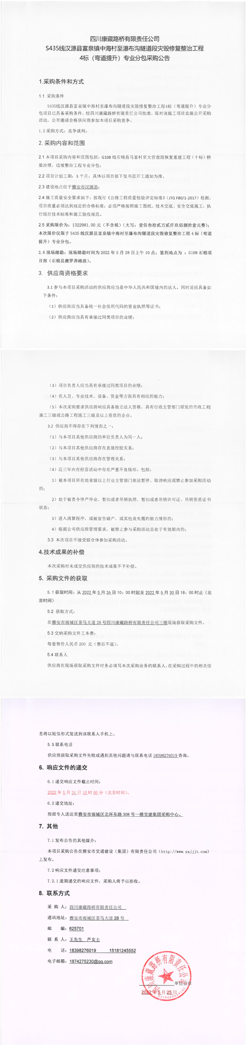 四川康藏路橋有限責任公司S435線漢源縣富泉鎮(zhèn)中海村至瀑布溝隧道段災毀修復整治工程4標(彎道提升)專業(yè)分包采購公告