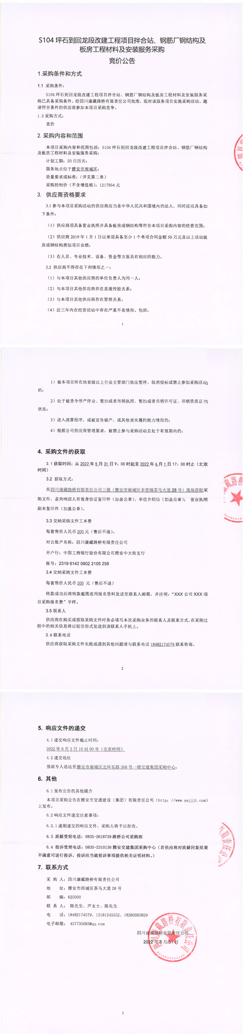 四川康藏路橋有限責任公司S104坪石到回龍段改建工程項目拌合站、鋼筋廠鋼結構及板房工程材料及安裝服務采購競價公告