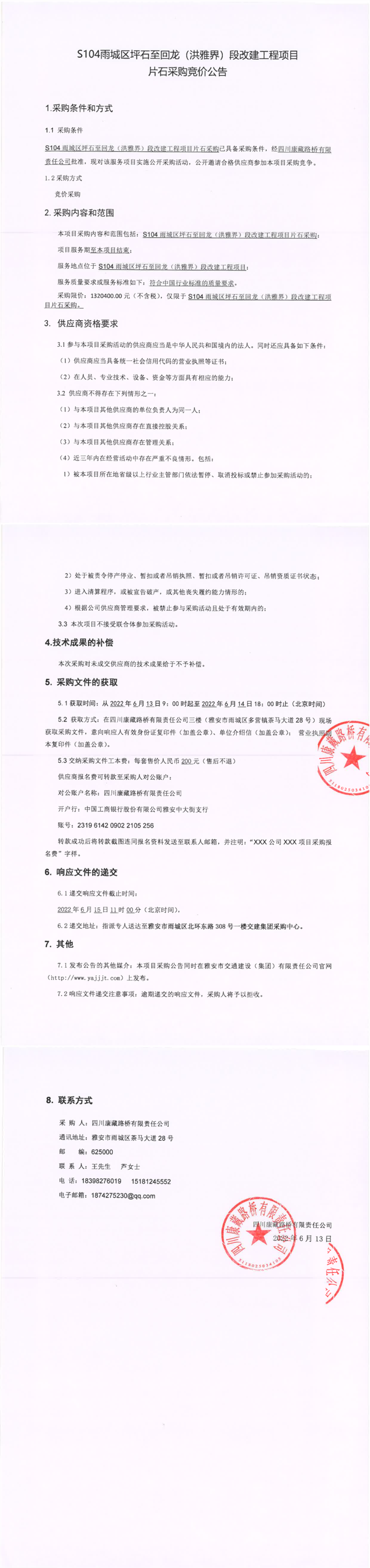 四川康藏路橋有限責(zé)任公司S104雨城區(qū)坪石至回龍(洪雅界)段改建工程項(xiàng)目片石采購(gòu)競(jìng)價(jià)公告
