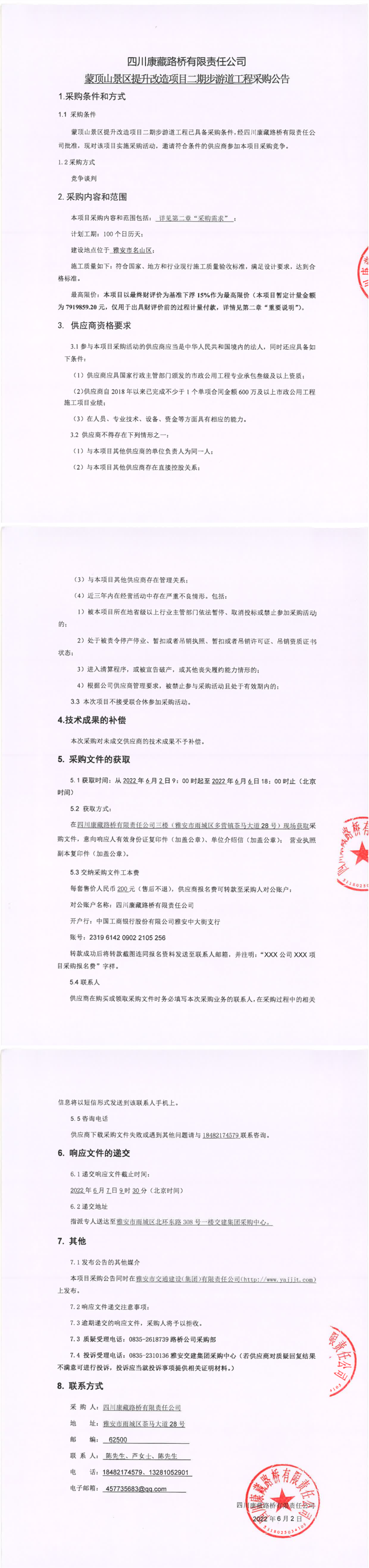 四川康藏路橋有限責(zé)任公司蒙頂山景區(qū)提升改造項(xiàng)目二期步游道工程采購公告