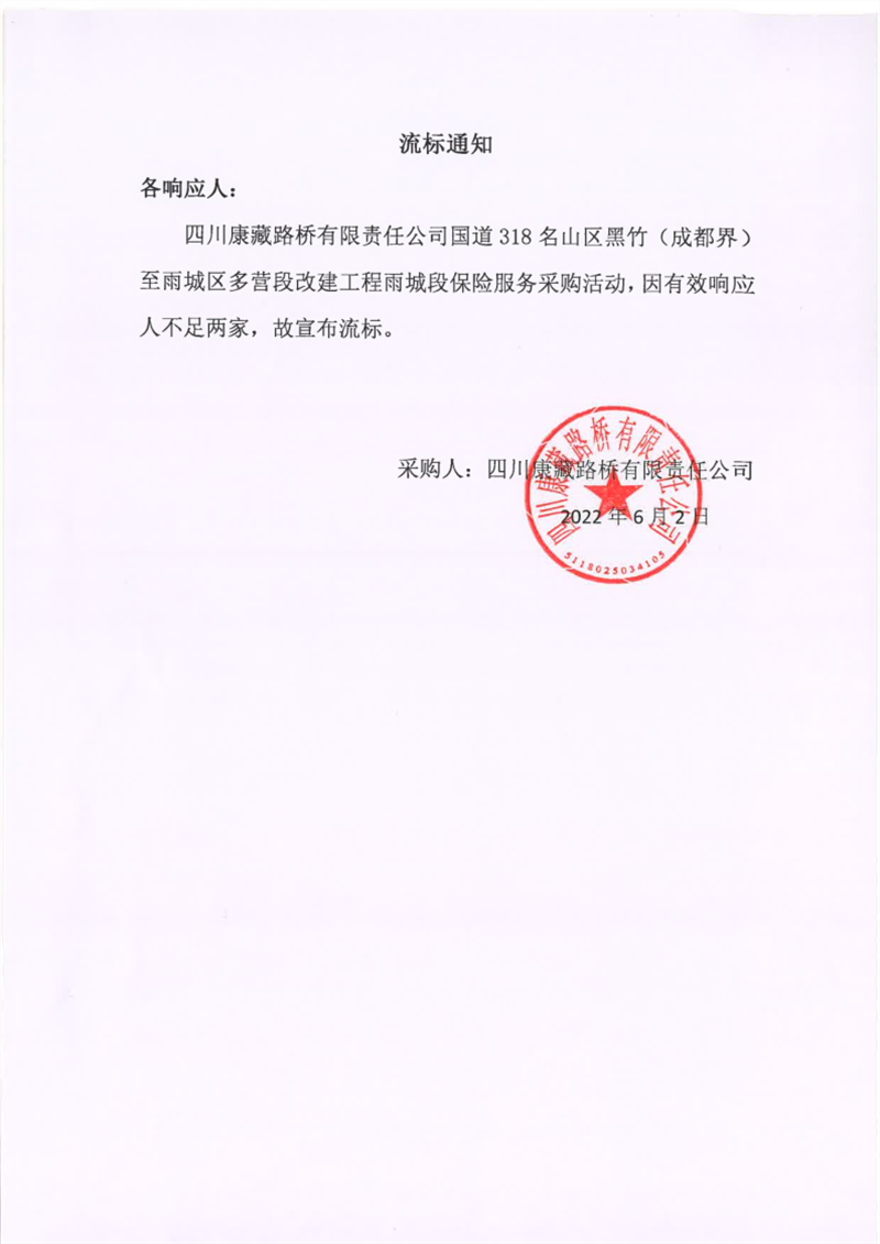 四川康藏路橋有限責(zé)任公司國道318名山區(qū)黑竹(成都界)至雨城區(qū)多營段改建工程雨城段保險服務(wù)采購流標(biāo)通知