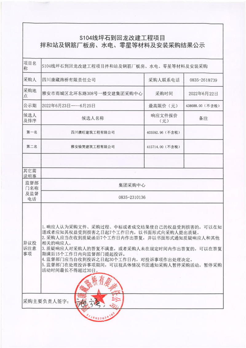 四川康藏路橋有限責任公司S104線坪石到回龍改建工程項目拌和站及鋼筋廠板房、水電、零星等材料及安裝采購結果公示