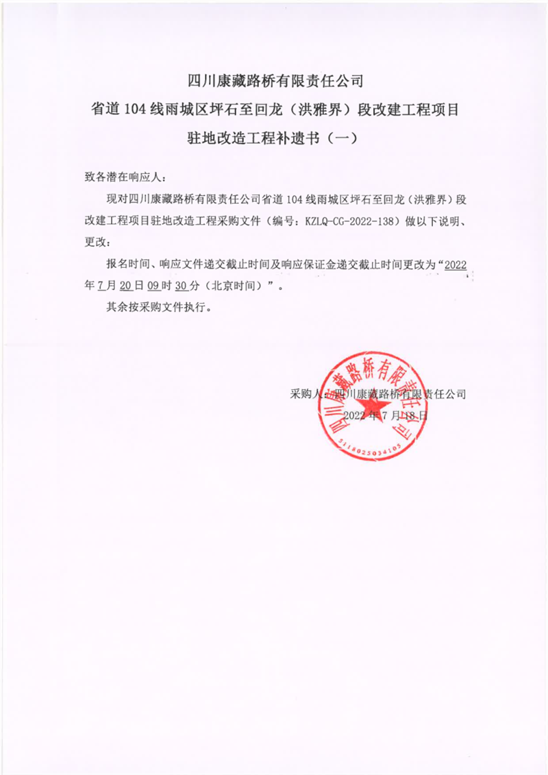 四川康藏路橋有限責(zé)任公司省道104線雨城區(qū)坪石至回龍(洪雅界)段改建工程項目駐地改造工程補遺書(一)
