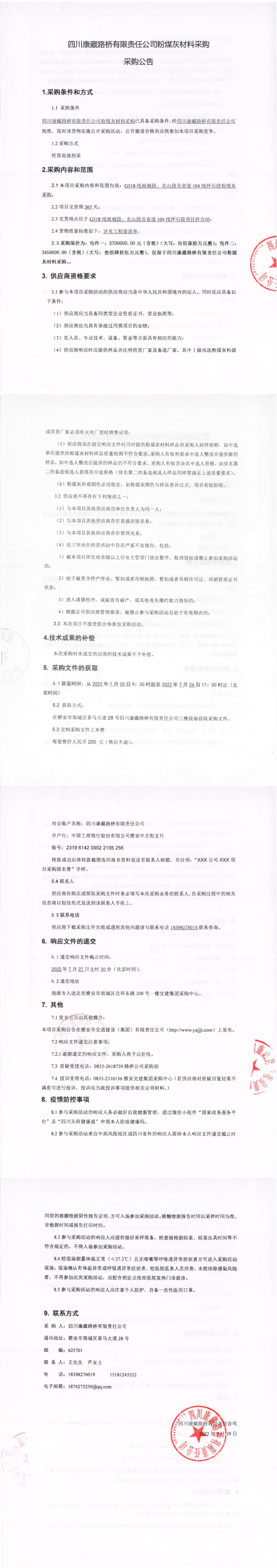 四川康藏路橋有限責任公司粉煤灰材料采購采購公告