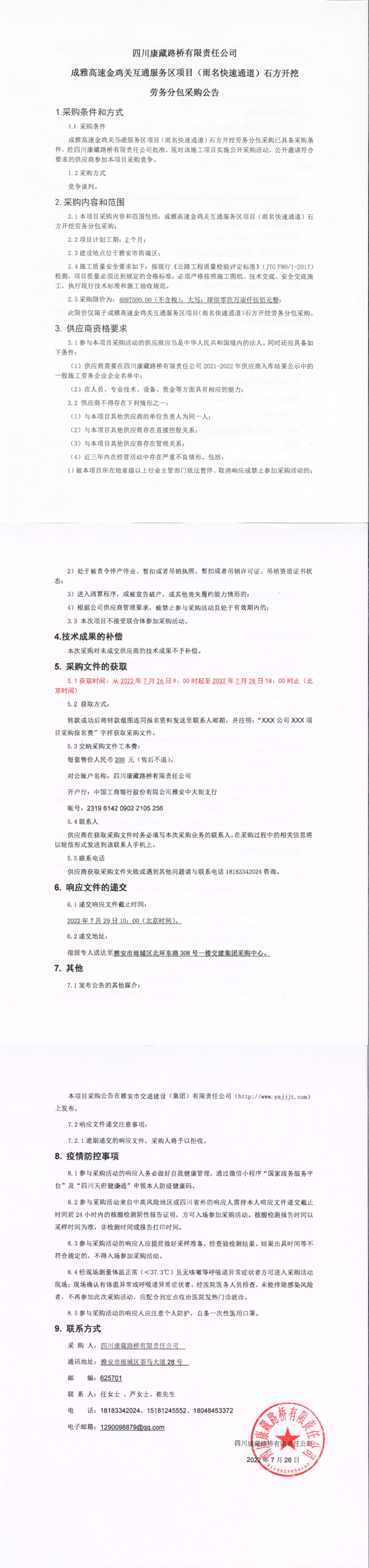 四川康藏路橋有限責任公司成雅高速金雞關(guān)互通及服務(wù)區(qū)項目(雨名快速通道)石方開挖勞務(wù)分包采購公告