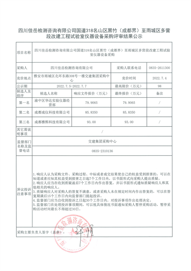 四川佳岳檢測(cè)咨詢有限公司國(guó)道318名山區(qū)黑竹(成都界)至雨城區(qū)多營(yíng)段改建工程試驗(yàn)室儀器設(shè)備采購(gòu)評(píng)審結(jié)果公示