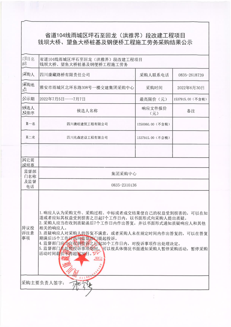 四川康藏路橋有限責(zé)任公司省道104線雨城區(qū)坪石至回龍(洪雅界)段改建工程項(xiàng)目錢壩大橋、望魚大橋樁基及鋼便橋工程施工勞務(wù)采購(gòu)結(jié)果公示