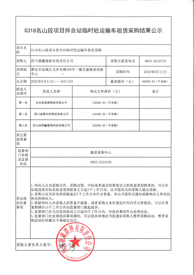 四川康藏路橋有限責(zé)任公司G318名山段項(xiàng)目拌合站臨時(shí)砼運(yùn)輸車租賃采購(gòu)結(jié)果公示