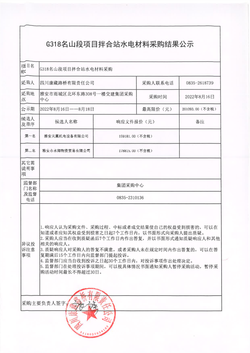 四川康藏路橋有限責(zé)任公司G318名山段項(xiàng)目拌合站水電材料采購(gòu)結(jié)果公示