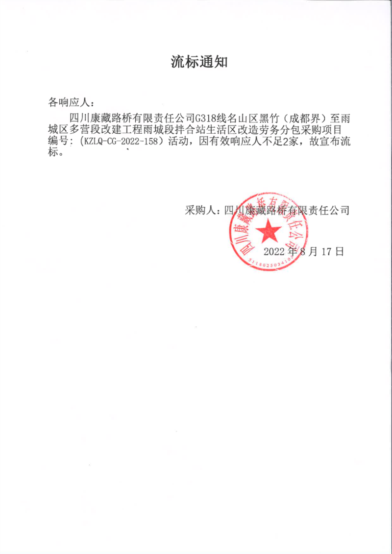 四川康藏路橋有限責(zé)任公司G318線名山區(qū)黑竹(成都界)至雨城區(qū)多營段改建工程雨城段拌合站生活區(qū)改造勞務(wù)分包采購項(xiàng)目流標(biāo)通知