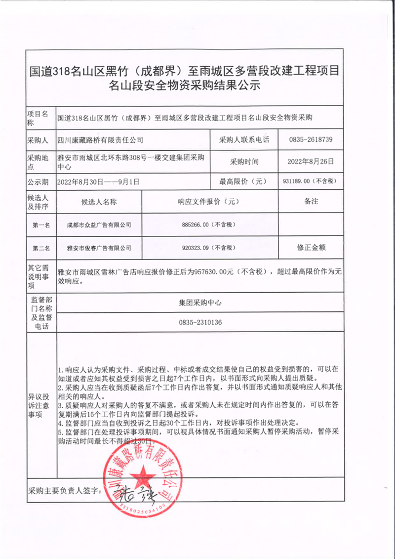 四川康藏路橋有限責(zé)任公司國道318名山區(qū)黑竹(成都界)至雨城區(qū)多營(yíng)段改建工程項(xiàng)目名山段安全物資采購結(jié)果公示