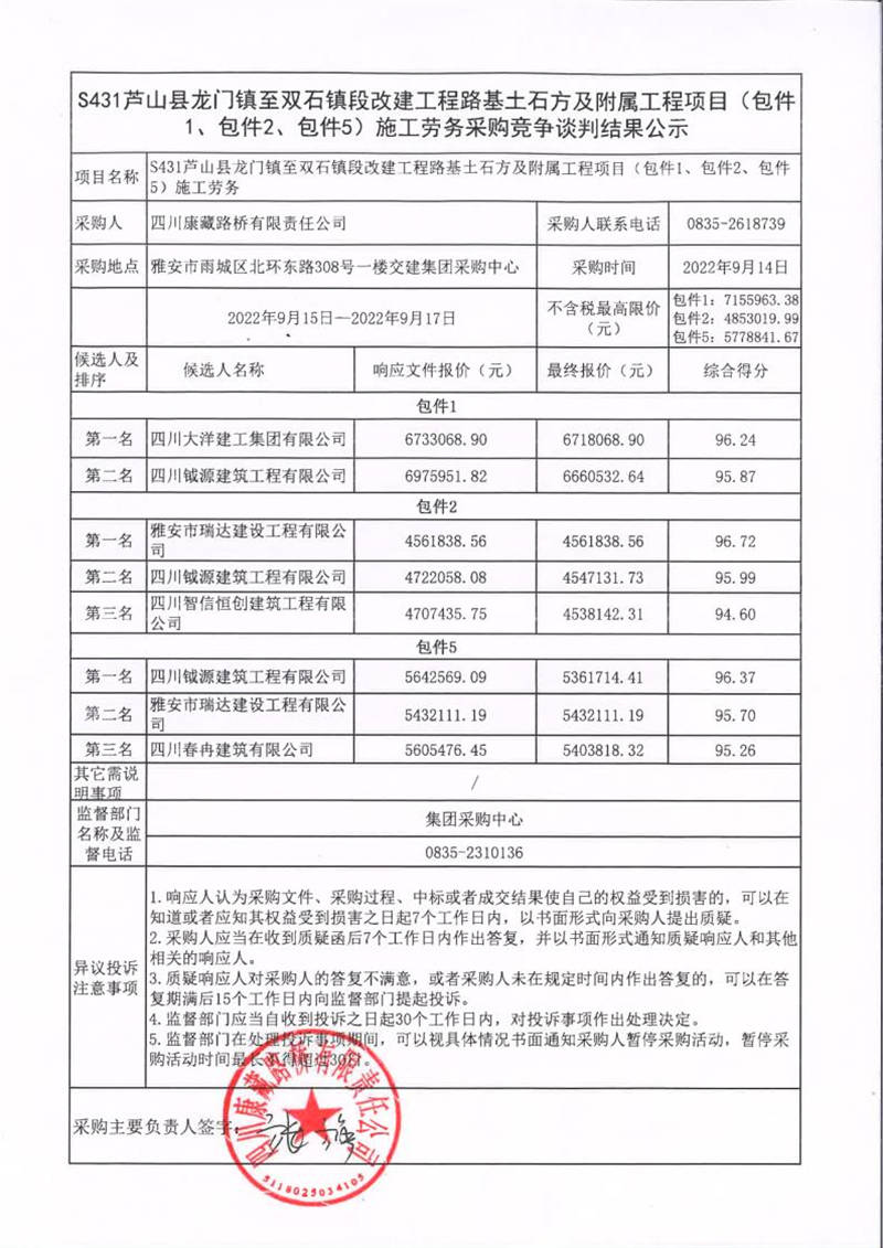 四川康藏路橋有限責任公司S431蘆山縣龍門鎮(zhèn)至雙石鎮(zhèn)段改建工程路基土石方及附屬工程項目(包件1、包件2、包件5)施工勞務采購競爭談判結(jié)果公示