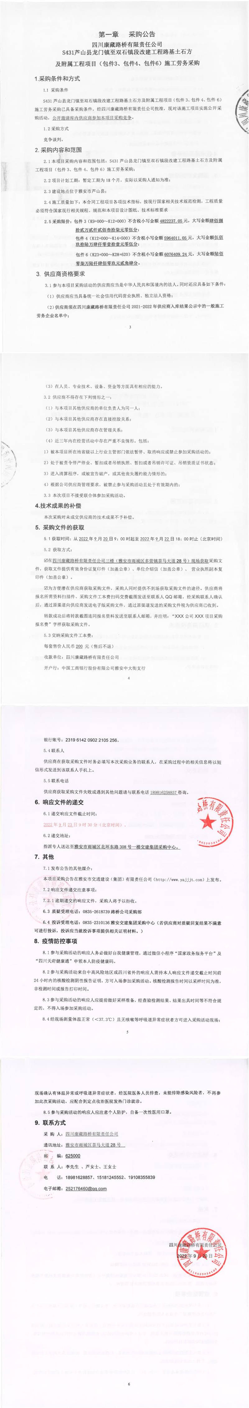 四川康藏路橋有限責任公司S431蘆山縣龍門鎮(zhèn)至雙石鎮(zhèn)段改建工程路基土石方及附屬工程項目(包件3、包件4、包件6)施工勞務采購公告