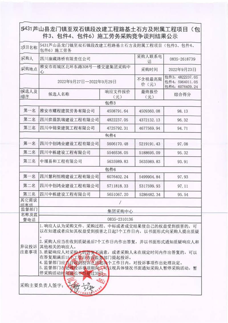 四川康藏路橋有限責(zé)任公司S431蘆山縣龍門鎮(zhèn)至雙石鎮(zhèn)段改建工程路基土石方及附屬工程項(xiàng)目(包件3、包件4、包件6)施工勞務(wù)采購競爭談判結(jié)果公示