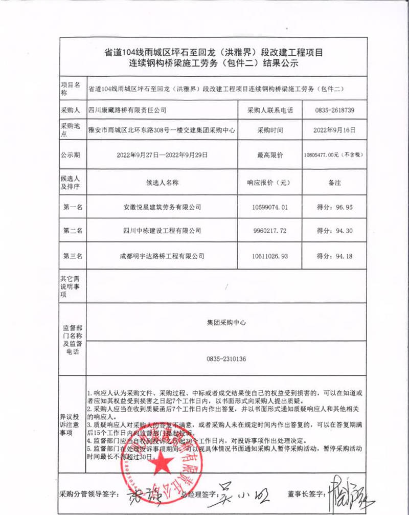 四川康藏路橋有限責(zé)任公司省道104線雨城區(qū)坪石至回龍(洪雅界)段改建工程項目連續(xù)鋼構(gòu)橋梁施工勞務(wù)(包件二)結(jié)果公示