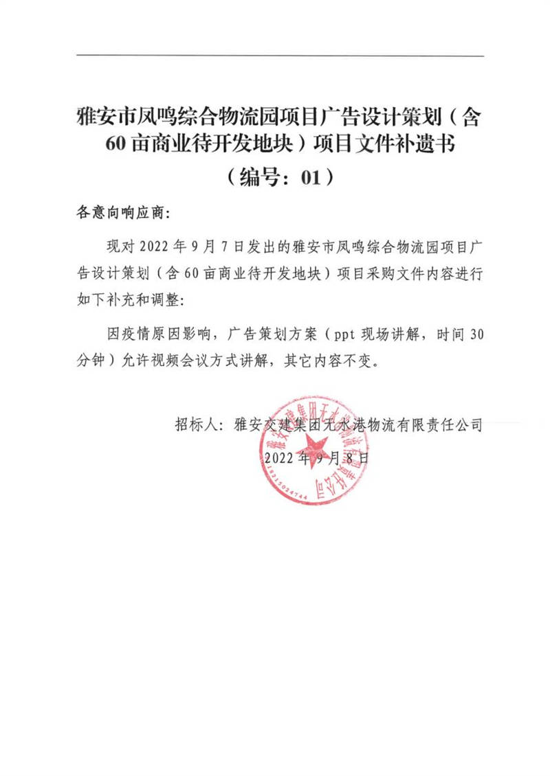 雅安交建集團(tuán)無(wú)水港物流有限責(zé)任公司雅安市鳳鳴綜合物流園項(xiàng)目廣告設(shè)計(jì)策劃(含60畝商業(yè)待開(kāi)發(fā)地塊)項(xiàng)目文件補(bǔ)遺書(shū)(編號(hào):01)