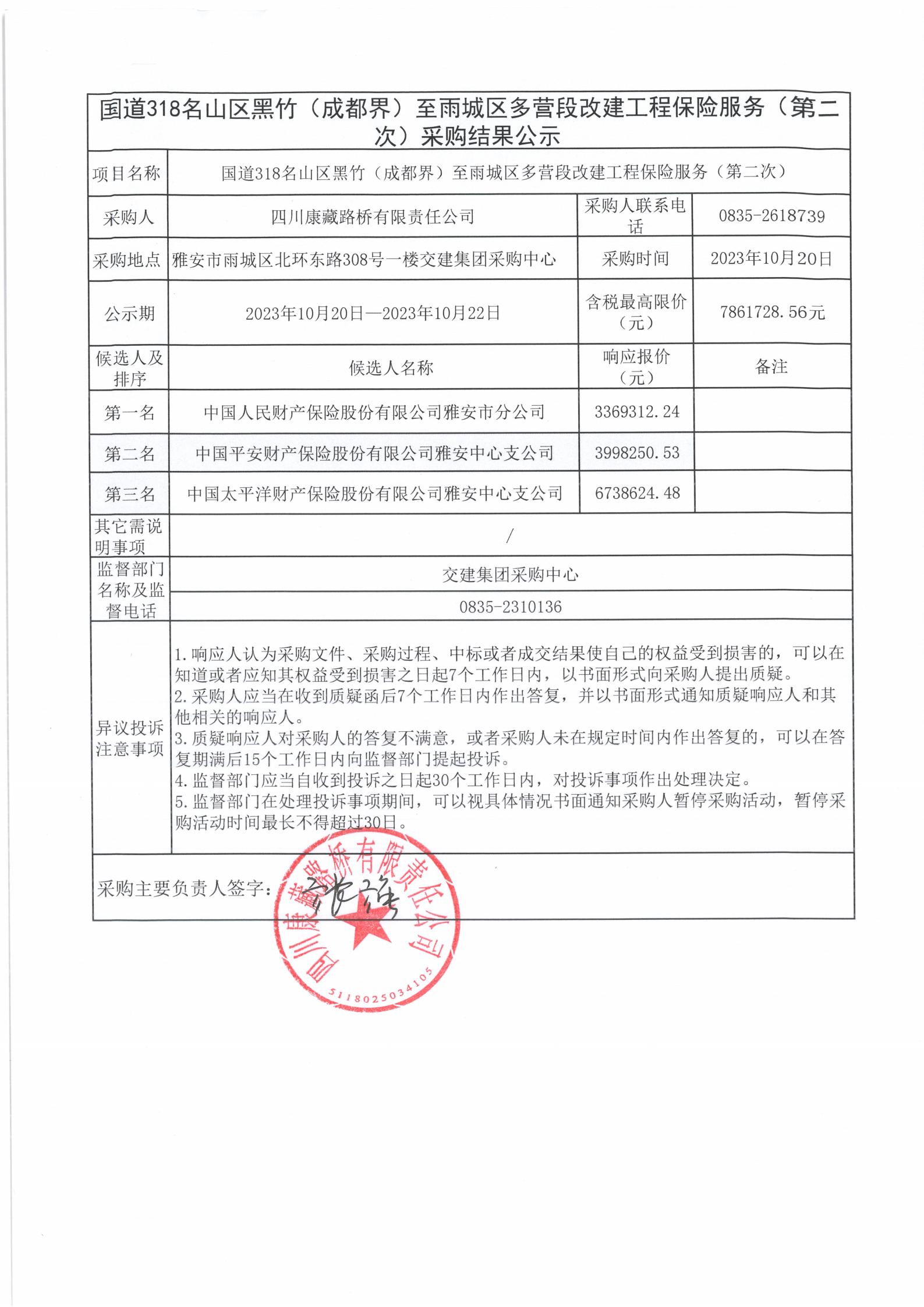 四川康藏路橋有限責(zé)任公司國(guó)道318名山區(qū)黑竹(成都界)至雨城區(qū)多營(yíng)段改建工程保險(xiǎn)服務(wù)(第二次)采購(gòu)結(jié)果公示