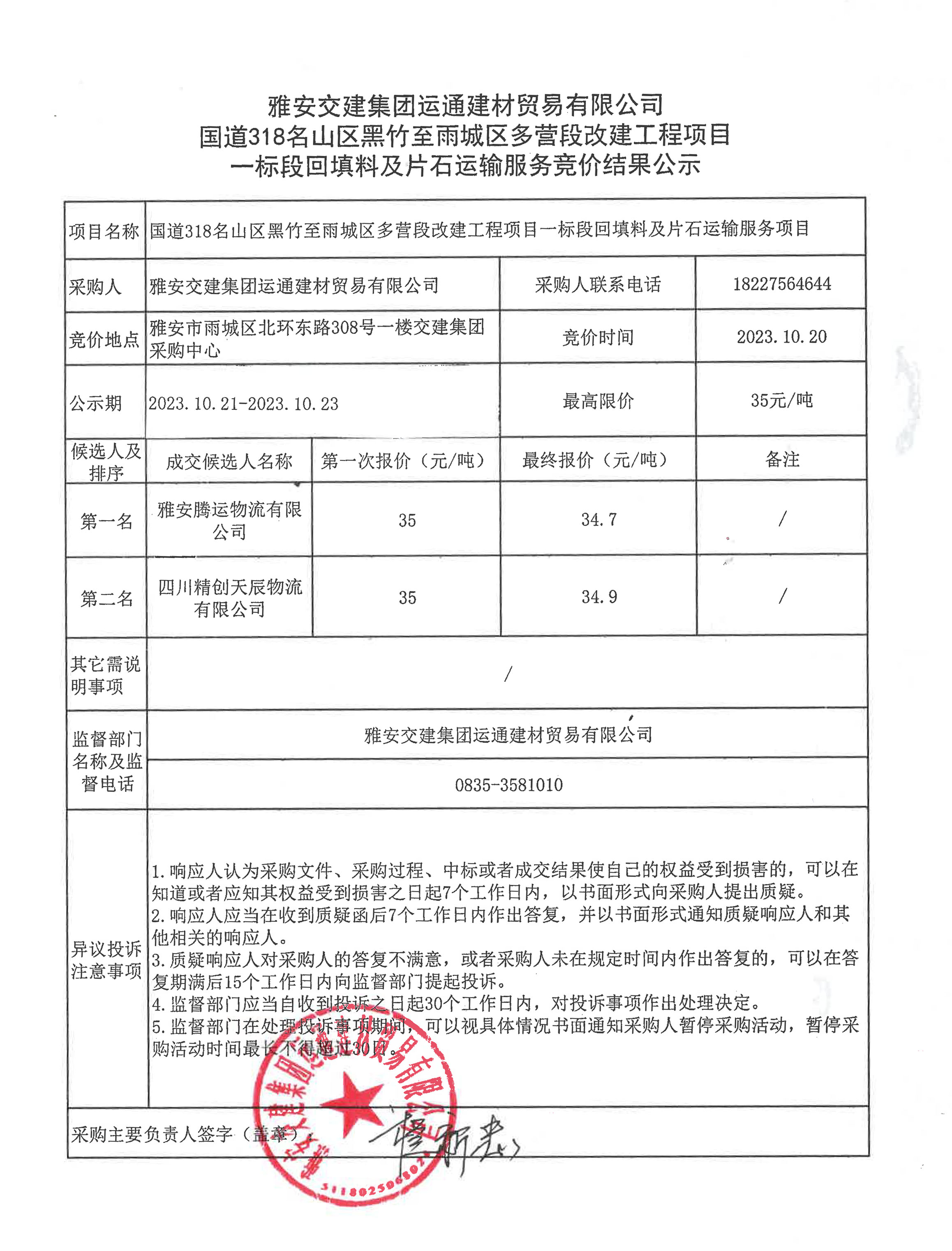 雅安交建集團(tuán)運(yùn)通建材貿(mào)易有限公司 國道318名山區(qū)黑竹至雨城區(qū)多營段改建工程項(xiàng)目一標(biāo)段回填料及片石運(yùn)輸服務(wù)競價(jià)結(jié)果公示