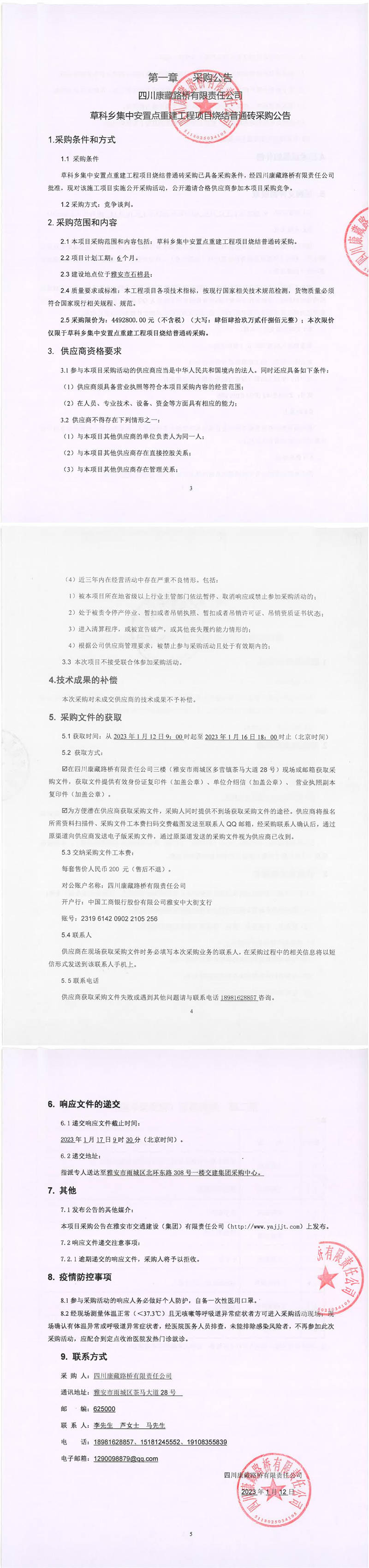 四川康藏路橋有限責任公司石棉草科鄉(xiāng)集中安置點重建工程項目燒結普通磚采購公告