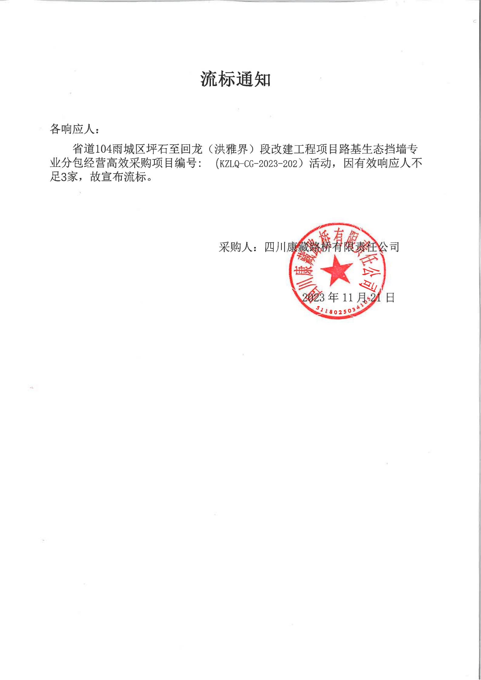 四川康藏路橋有限責(zé)任公司省道104雨城區(qū)坪石至回龍(洪雅界)段改建工程項(xiàng)目路基生態(tài)擋墻專業(yè)分包經(jīng)營(yíng)高效采購(gòu)流標(biāo)通知