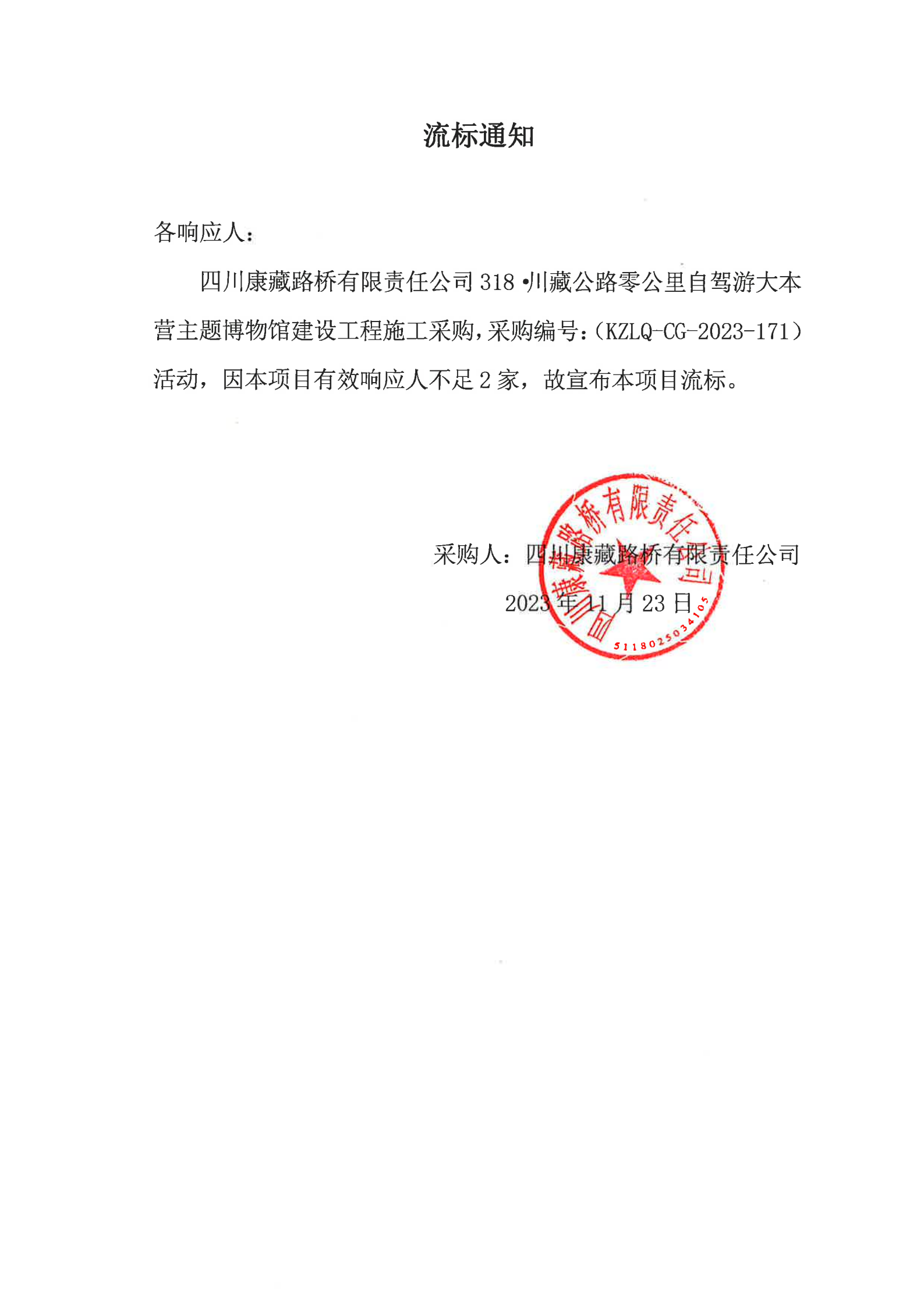 四川康藏路橋有限責(zé)任公司318·川藏公路零公里自駕游大本營主題博物館建設(shè)工程施工采購流標通知