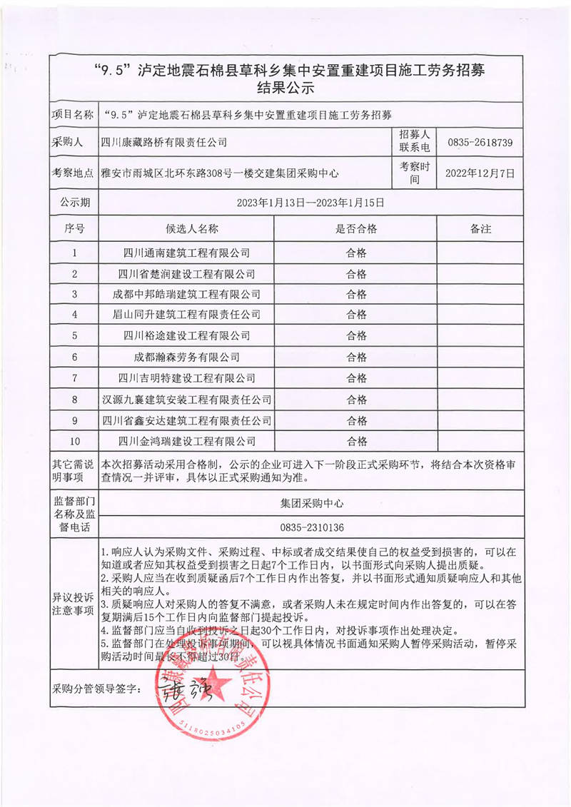 四川康藏路橋有限責(zé)任公司“9.5”瀘定地震石棉縣草科鄉(xiāng)集中安置重建項(xiàng)目施工勞務(wù)招募結(jié)果公示