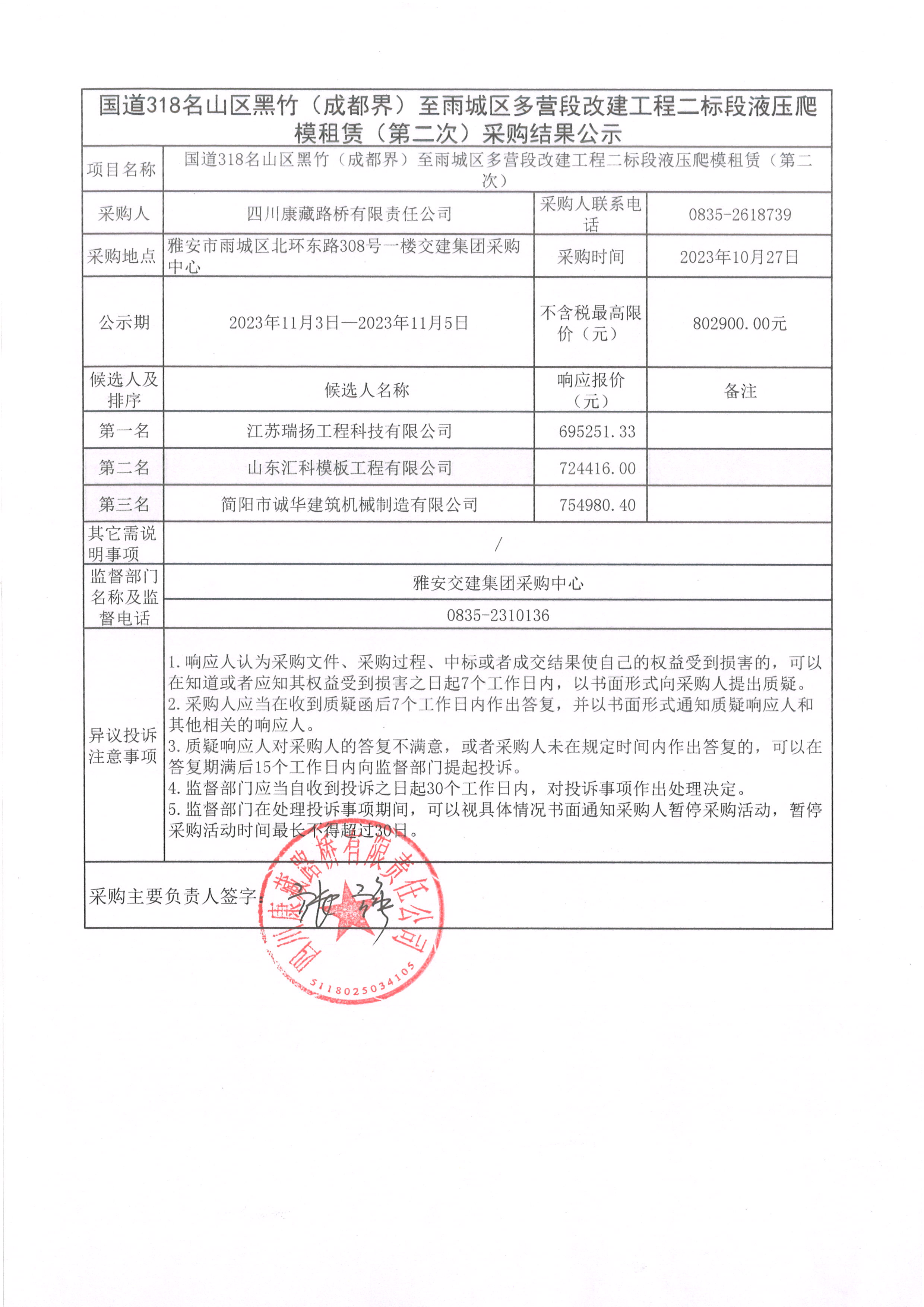 四川康藏路橋有限責任公司國道318名山區(qū)黑竹(成都界)至雨城區(qū)多營段改建工程二標段液壓爬模租賃(第二次)采購結果公示