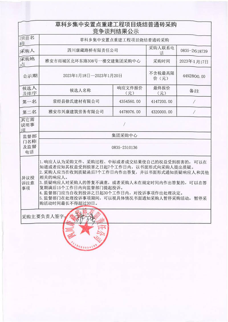 四川康藏路橋有限責(zé)任公司草科鄉(xiāng)集中安置點(diǎn)重建工程項(xiàng)目燒結(jié)普通磚采購競(jìng)爭(zhēng)談判結(jié)果公示