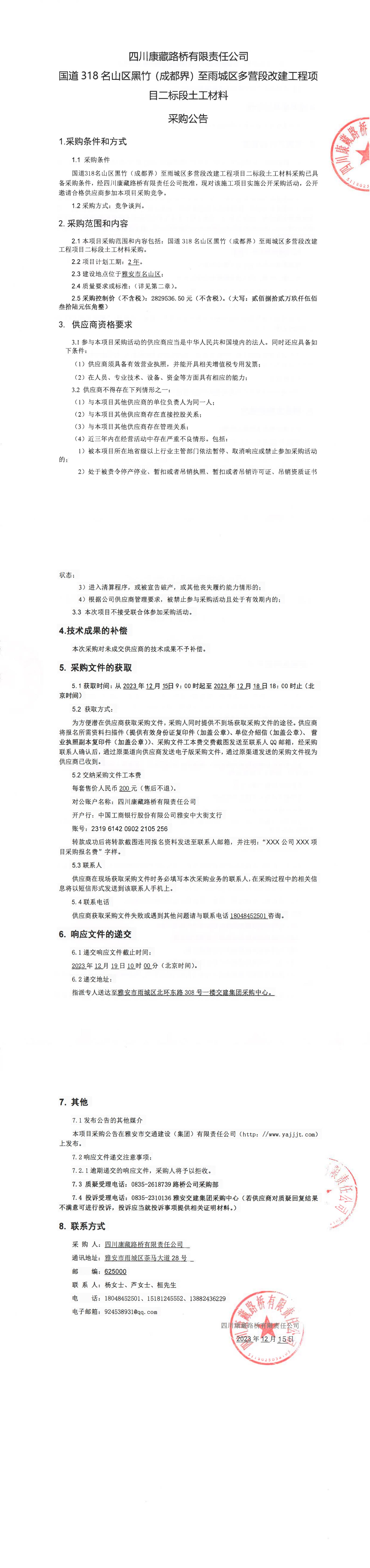 四川康藏路橋有限責任公司G318線雨城區(qū)水廠至藏茶村入口段中修專業(yè)分包工程競爭談判結(jié)果公示