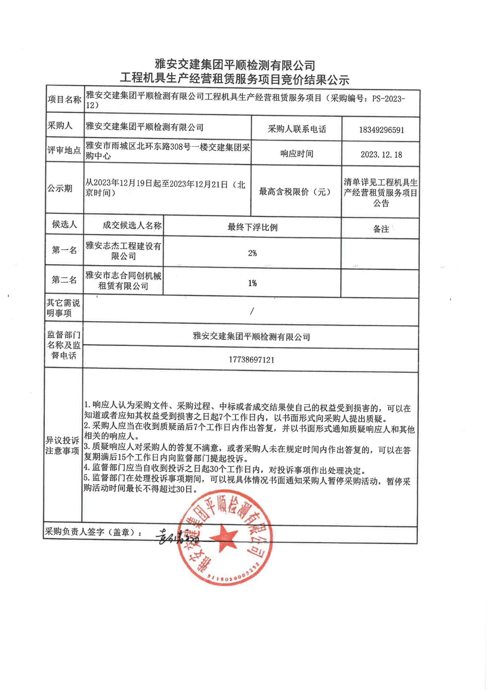 雅安交建集團(tuán)平順檢測(cè)有限公司工程機(jī)具生產(chǎn)經(jīng)營租賃服務(wù)項(xiàng)目競(jìng)價(jià)結(jié)果公示