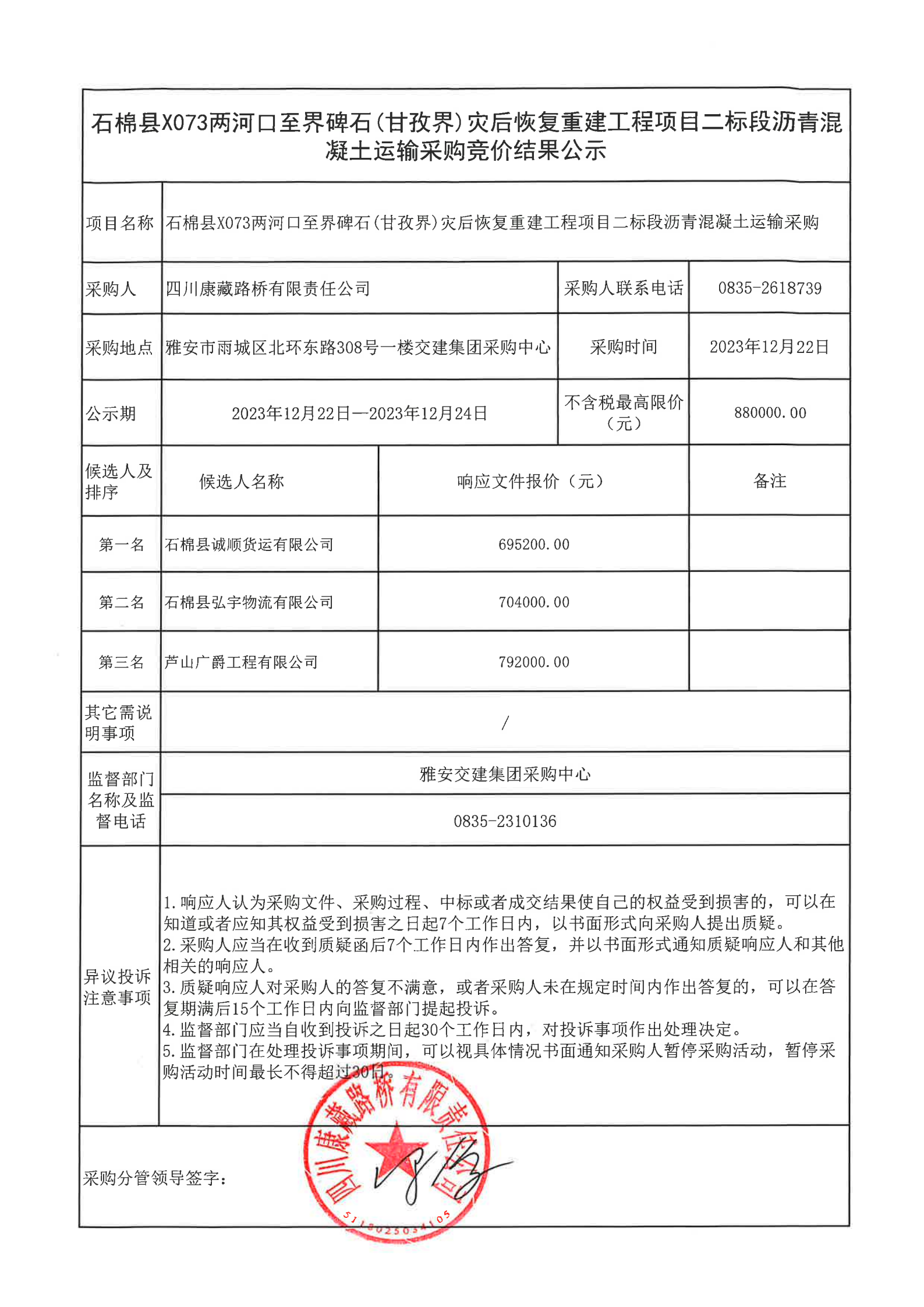 四川康藏路橋有限責任公司石棉縣 X073 兩河口至界碑石(甘孜界)災(zāi)后恢復(fù)重建工程項目二標段瀝青混凝土運輸采購競價結(jié)果公示
