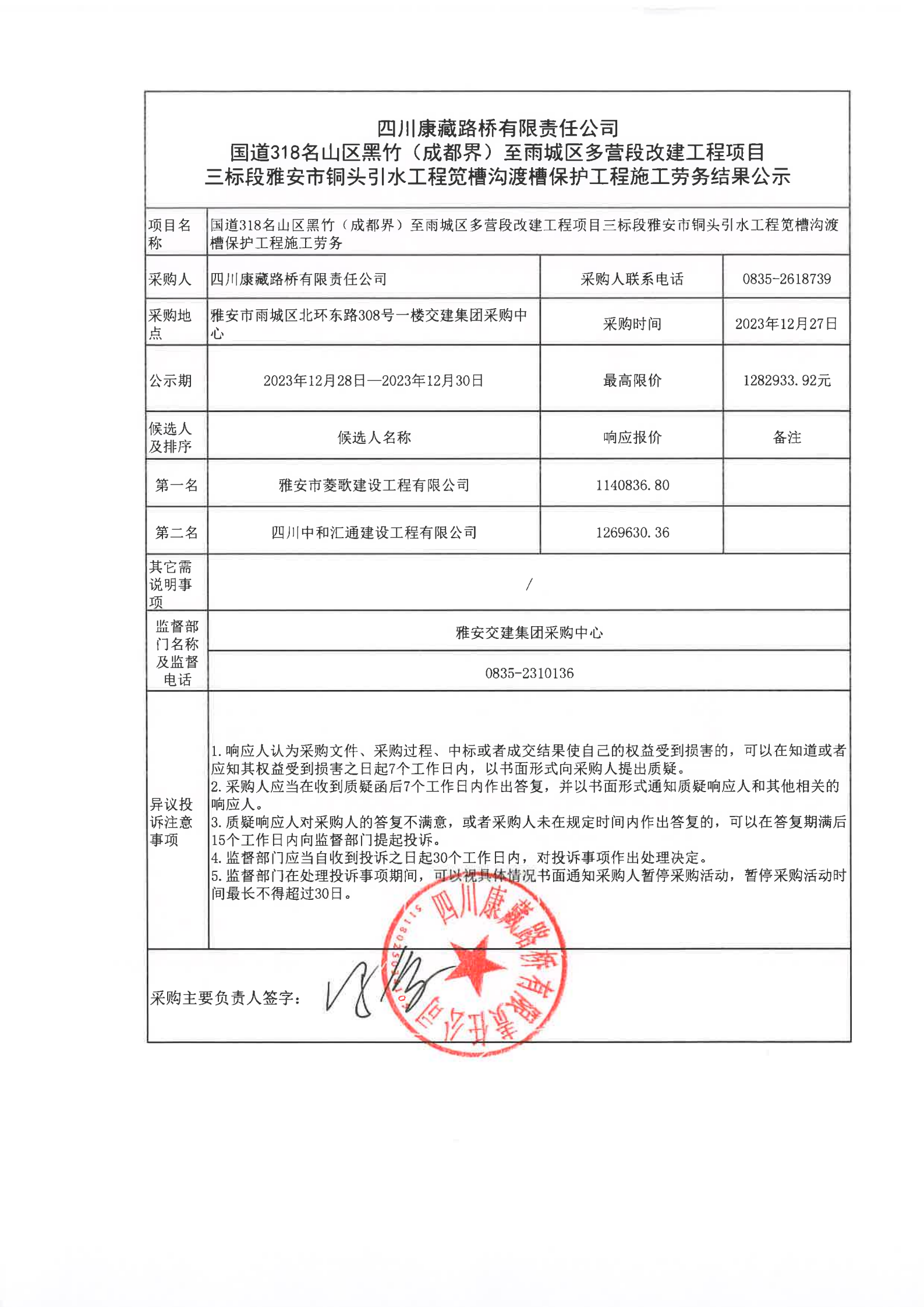 四川康藏路橋有限責(zé)任公司國道318名山區(qū)黑竹(成都界)至雨城區(qū)多營段改建工程項目三標(biāo)段雅安市銅頭引水工程筧槽溝渡槽保護工程施工勞務(wù)結(jié)果公示