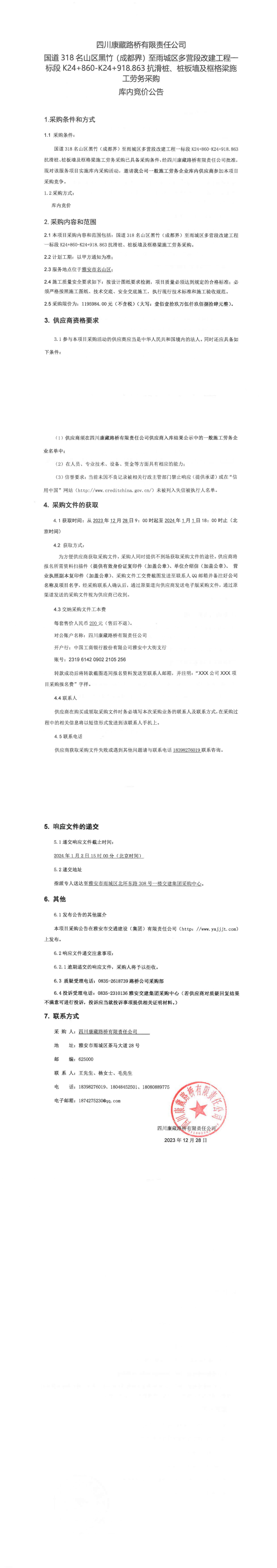 四川康藏路橋有限責任公司國道318名山區(qū)黑竹(成都界)至雨城區(qū)多營段改建工程一標段K24+860-K24+918.863抗滑樁、樁板墻及框格梁施工勞務采購庫內競價公告