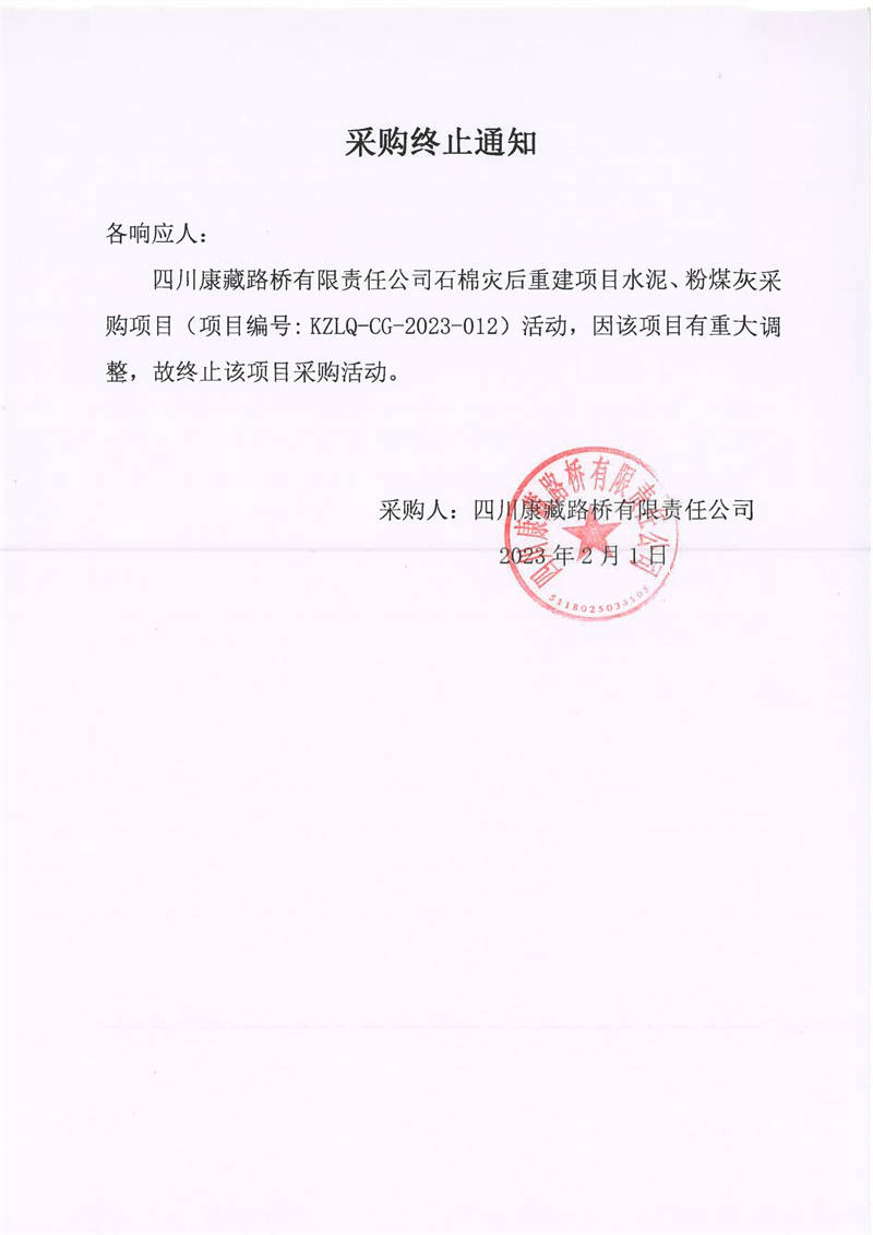 四川康藏路橋有限責(zé)任公司石棉災(zāi)后重建項(xiàng)目水泥、粉煤灰采購(gòu)項(xiàng)目采購(gòu)終止通知