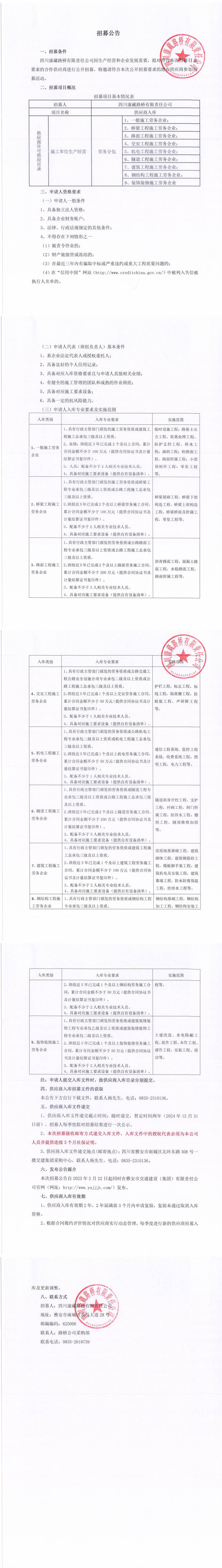 四川康藏路橋有限責(zé)任公司2023年供應(yīng)商入庫(施工單位生產(chǎn)經(jīng)營勞務(wù)分包)招募公告