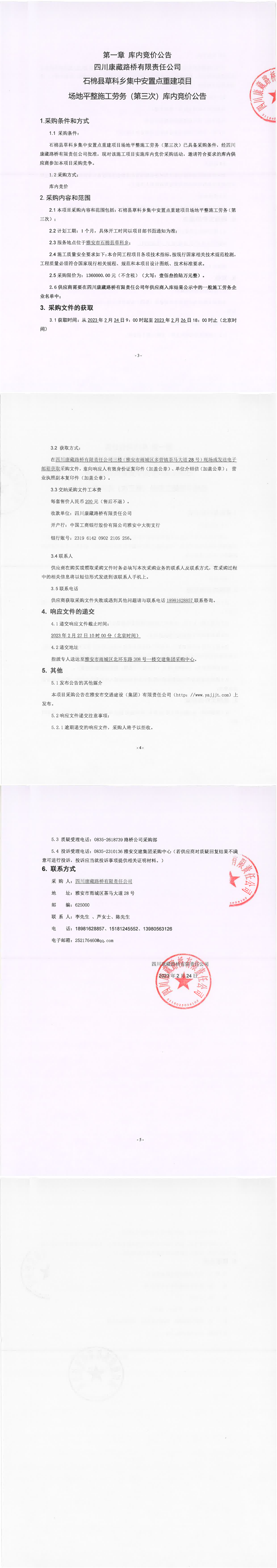 四川康藏路橋有限責任公司石棉縣草科鄉(xiāng)集中安置點重建項目場地平整施工勞務(第三次)庫內(nèi)競價