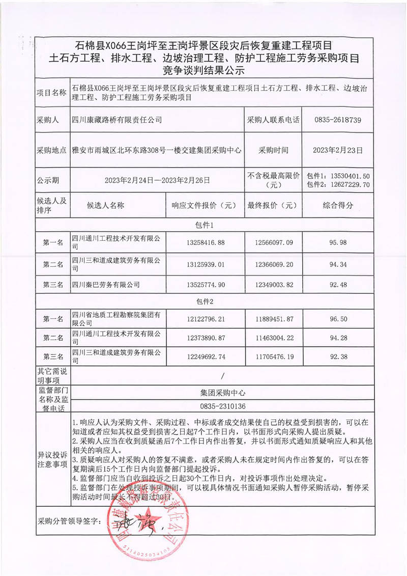 四川康藏路橋有限責任公司石棉縣X066王崗坪至王崗坪景區(qū)段災后恢復重建工程項目土石方工程、排水工程、邊坡治理工程、防護工程施工勞務采購項目競爭談判結果公示