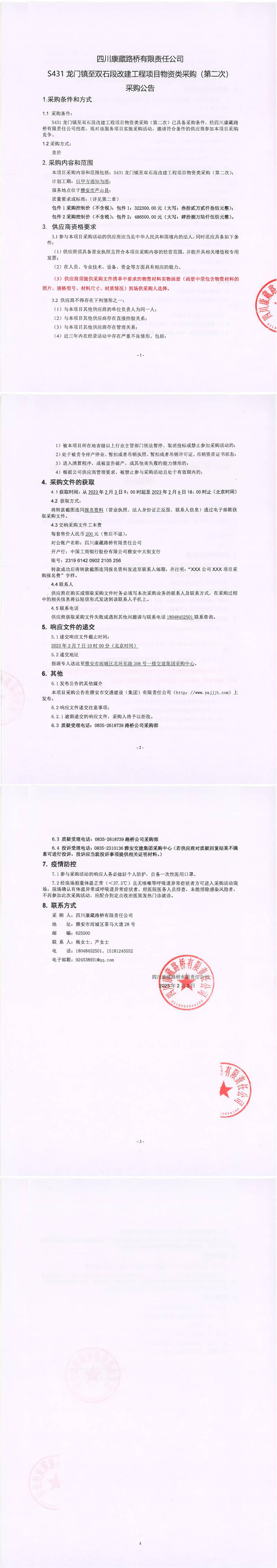 四川康藏路橋有限責任公司S431龍門鎮(zhèn)至雙石段改建工程項目物資類采購(第二次)采購公告
