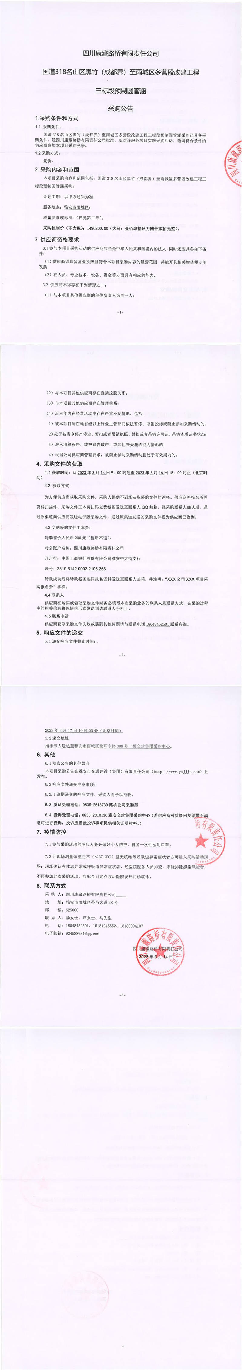 四川康藏路橋有限責任公司國道318名山區(qū)黑竹(成都界)至雨城區(qū)多營段改建工程三標段預制圓管涵采購公告