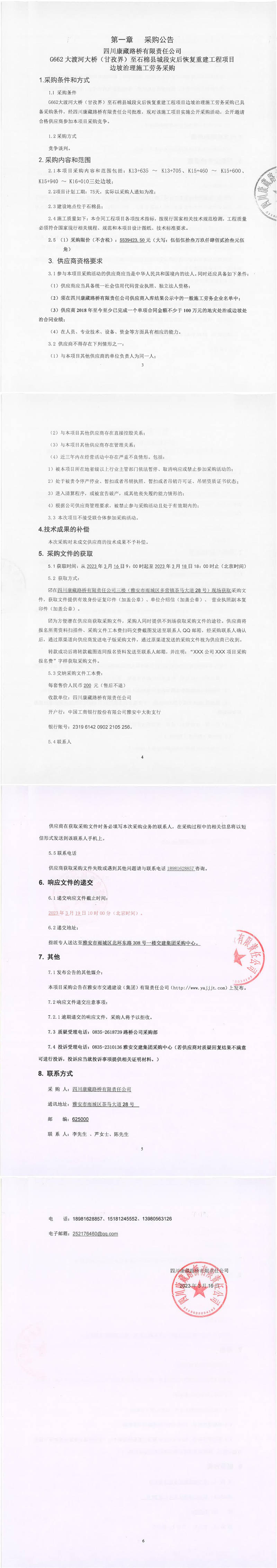 四川康藏路橋有限責任公司G662大渡河大橋(甘孜界)至石棉縣城段災后恢復重建工程項目邊坡治理施工勞務采購公告