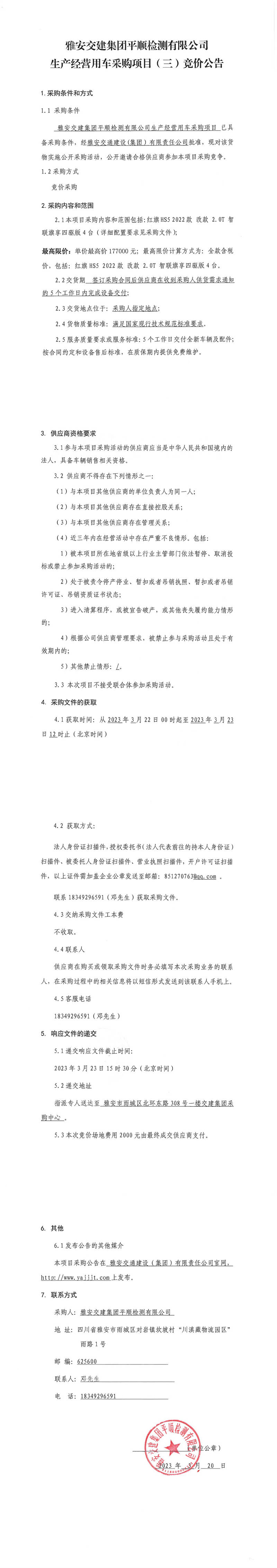 雅安交建集團平順檢測有限公司平順公司生產(chǎn)經(jīng)營用車采購項目(三)競價公告