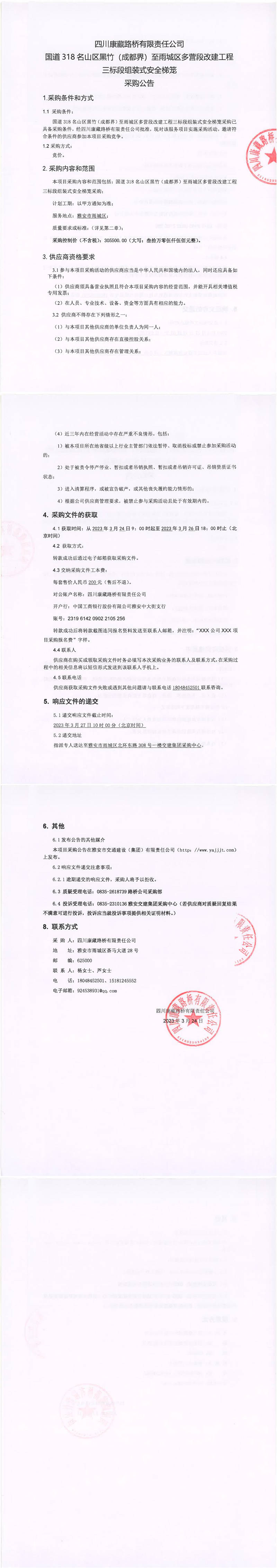 四川康藏路橋有限責(zé)任公司國(guó)道318名山區(qū)黑竹(成都界)至雨城區(qū)多營(yíng)段改建工程三標(biāo)段組裝式安全梯籠采購(gòu)公告