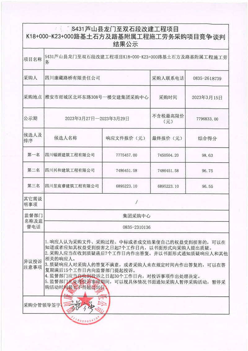 四川康藏路橋有限責(zé)任公司S431蘆山縣龍門至雙石段改建工程項(xiàng)目K18+000-K23+000路路基附屬工程施工勞務(wù)采購(gòu)項(xiàng)目競(jìng)爭(zhēng)談判結(jié)果公示